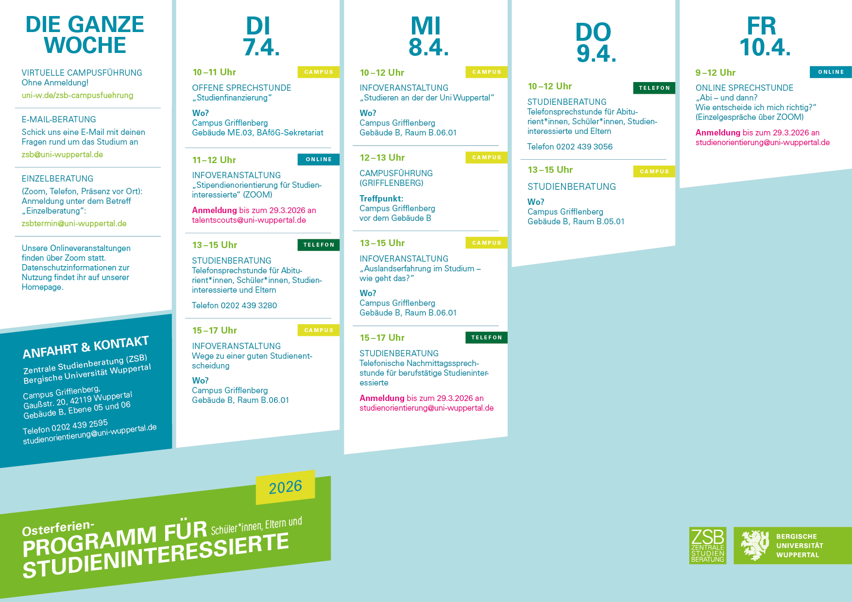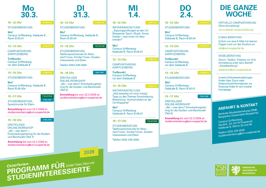 In den Oster- und Herbstferien bietet die Zentrale Studienberatung der Bergischen Universität Wuppertal für Studieninteressierte ein buntes Programm an digitalen Veranstaltungen und Veranstaltungen in Präsenz zum Thema Studienorientierung. Ihr bekommt innerhalb dieser Schnuppertage die Möglichkeit, Infoveranstaltungen zum Thema „Studieren an der Uni Wuppertal“, „Bewerbung und Einschreibung“, „Wege einer guten Studienwahlentscheidung“ oder anderweitigen Themen zu besuchen, die Uni über eine Campusführung zu besichtigen und Fragen zur Studienorientierung im Rahmen eines individuellen Gesprächs mit den Studienberater*innen zu klären.